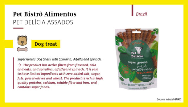 Pet Delícia Assados Super Greens Dog Snack with Spirulina, Alfalfa and Spinach is rich in proteins, calcium, fibre and iron. It contains superfoods and active fibres from flaxseed, chia, oats, spirulina, alfalfa and spinach (Brazil).