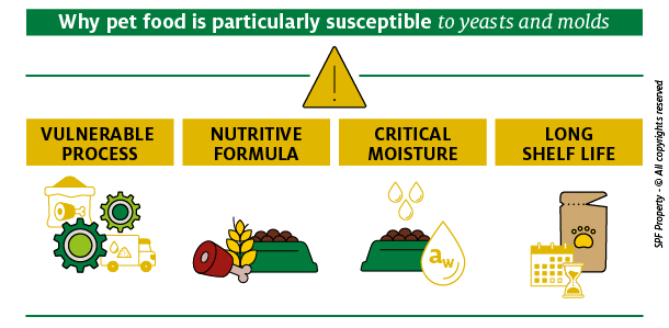Why pet food is particularly susceptible to yeasts and molds