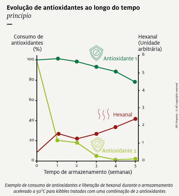 Os níveis de compostos oxidativos específicos e antioxidantes residuais no Pet Food em processo de envelhecimento podem ser usados de forma pertinente como indicadores para avaliar a estabilidade oxidativa ao longo do tempo.
